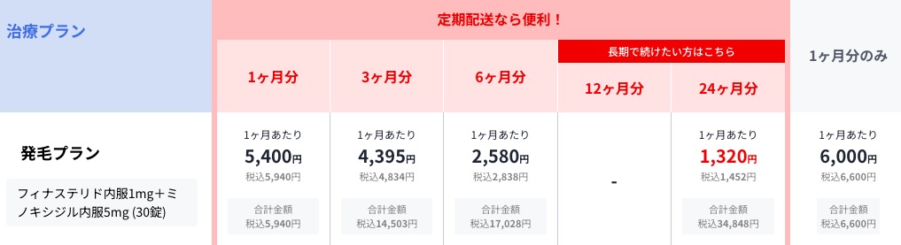 | フィナステリド/月 | ![]() 1,349円〜 12ヶ月定期配送価格 | ![]() 2,090円〜 | ![]() 初月1,800円 2回目以降3,600円 |