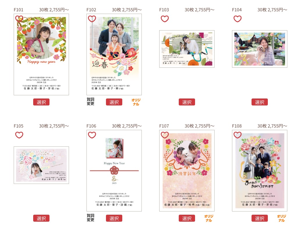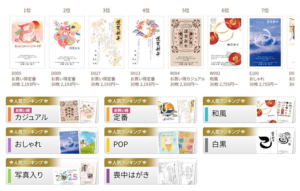 たかが年賀状、されど年賀状。年賀状、寒中見舞い、喪中。すべてこちらのデザインでお世話になっています。ありふれたデザインではなく、『らしさ』のあふれる洒落がきいているからこそ出したくなる仕上がりになります。毎年我が家の年賀状が楽しみだと大好評なので、少々プレッシャーではありますが、作成に燃えます。これからも更に素敵なデザインに巡り会えますよう、応援させていただきます。