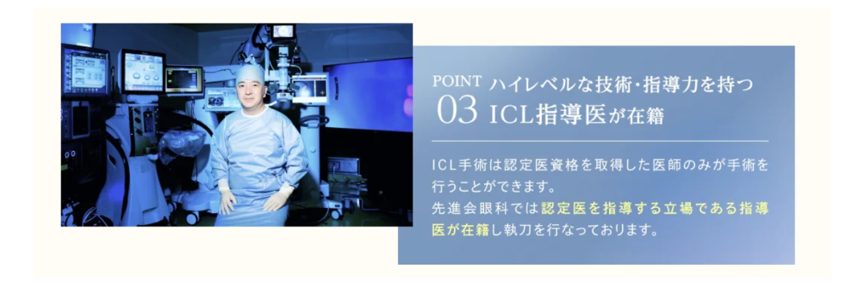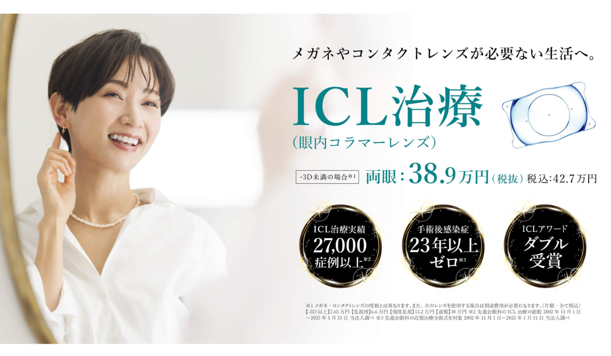 ICL治療を行っているクリニックの中でも、特に治療の評判が良くコスパも抜群、アフターケアにも定評があるのが先進会眼科。